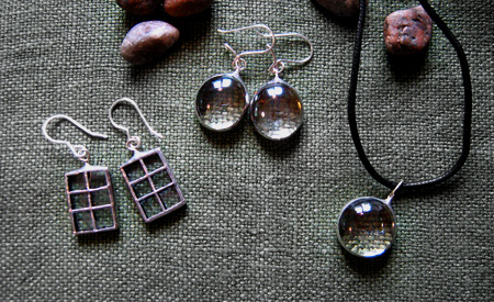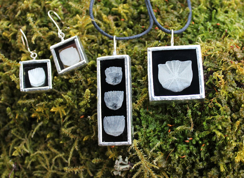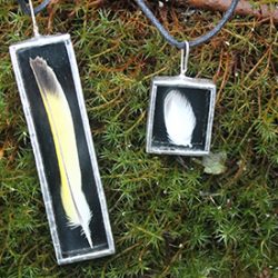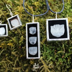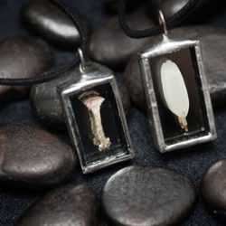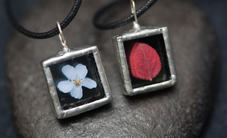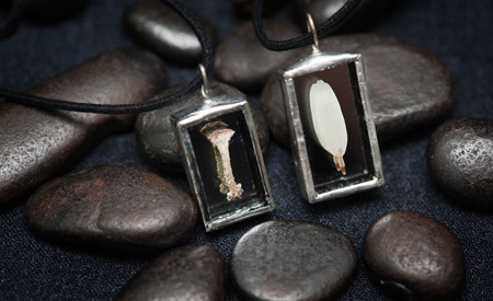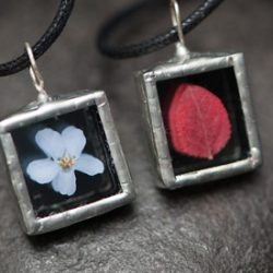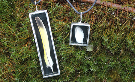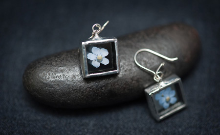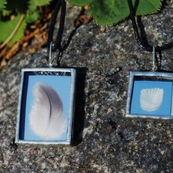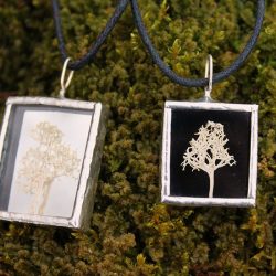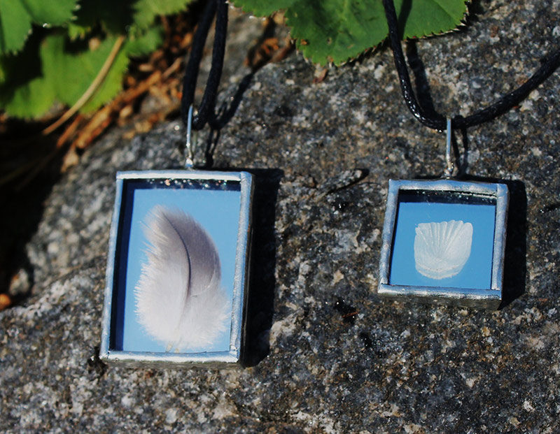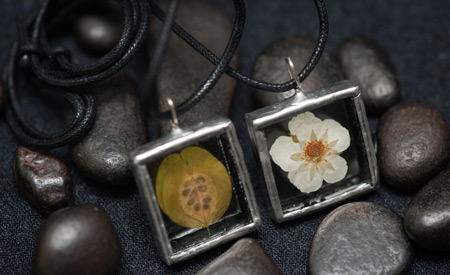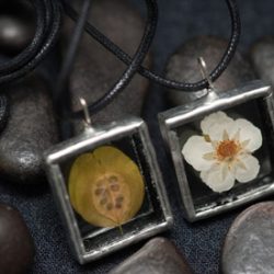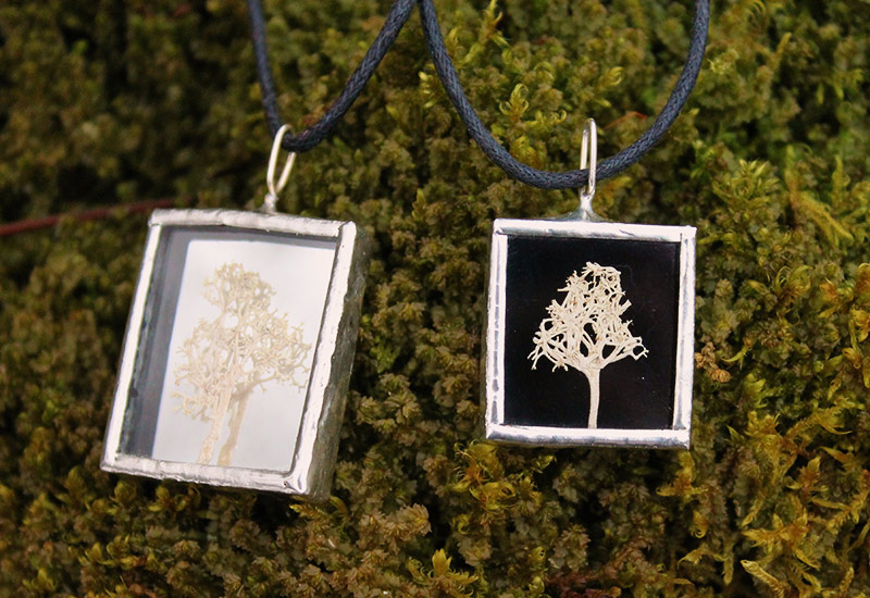 Kasvikoruissani kasvit ovat keräämiäni aitoja luonnonkasveja lisäksi koruissani on kalansuomuja ja linnun höyheniä. Koruilla on mallisuoja. Riipuksissa käytän lyijytöntä tinaa.